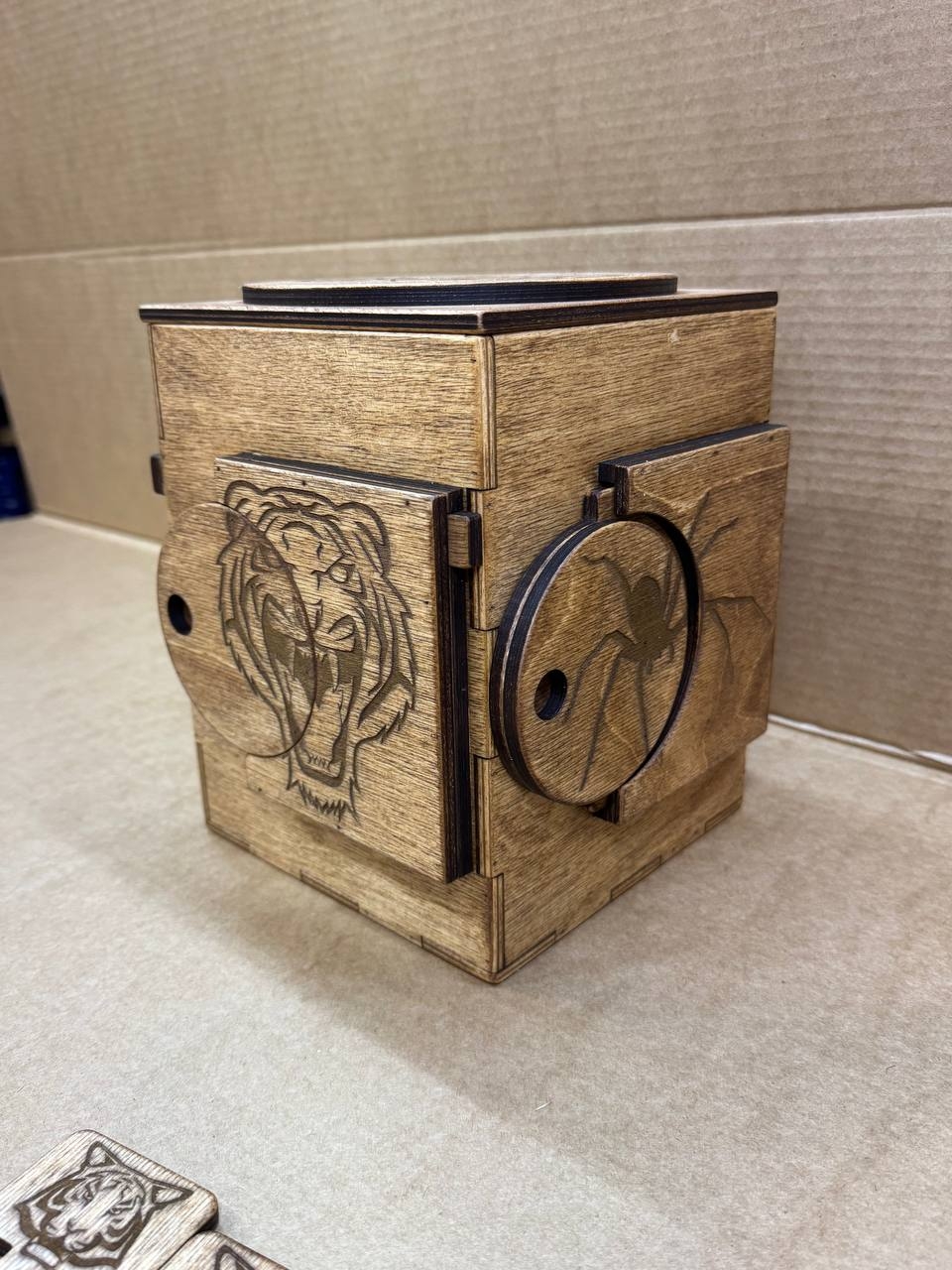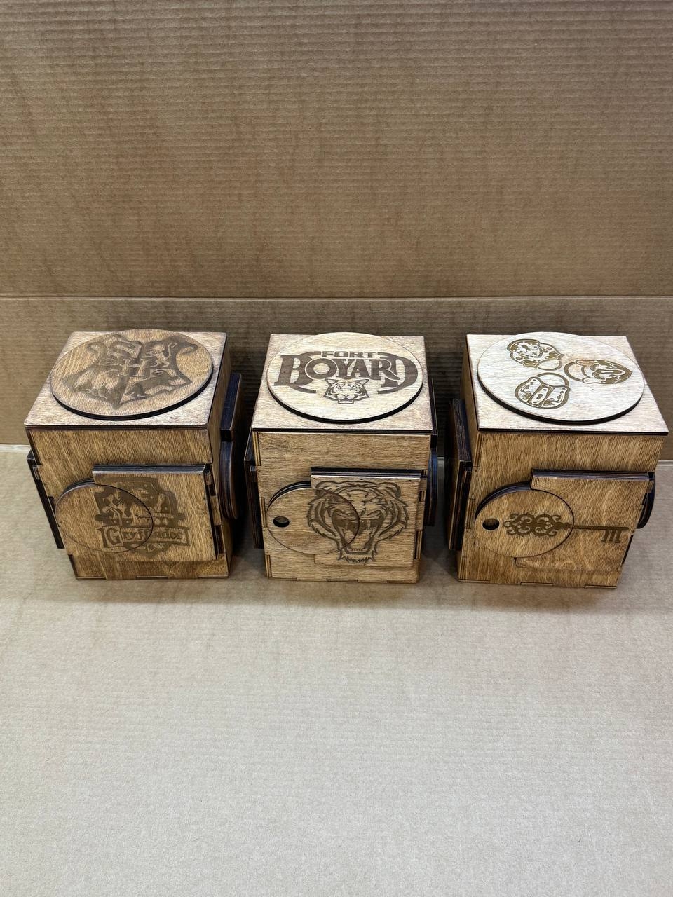 Участники квеста находят или получают за выполненные задания ключ-карты и вставляют их в отверстия коробочки