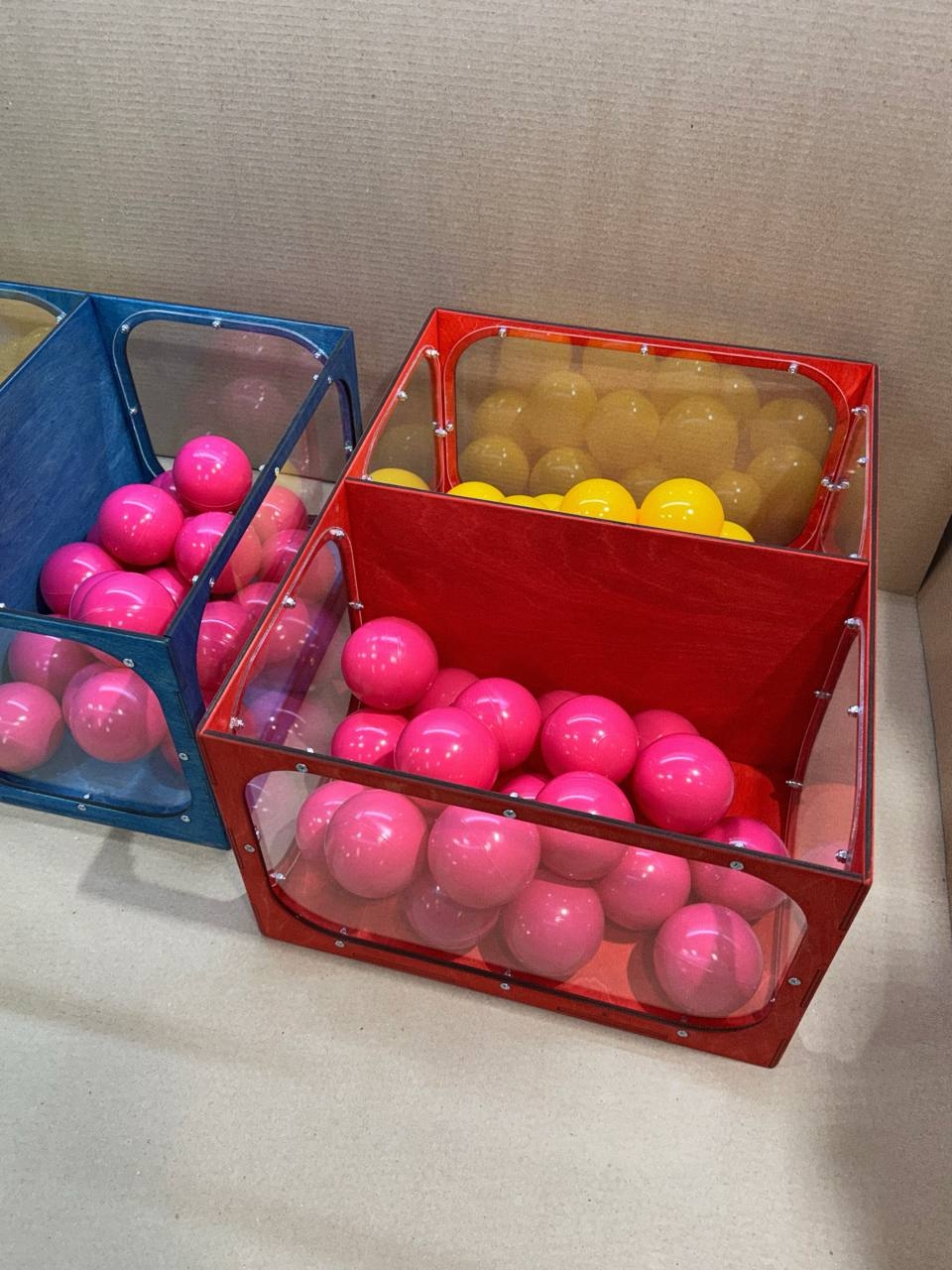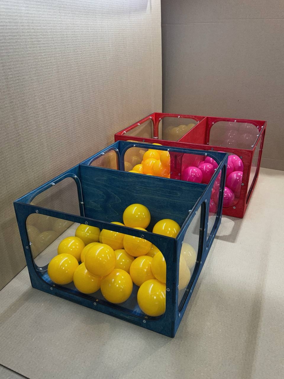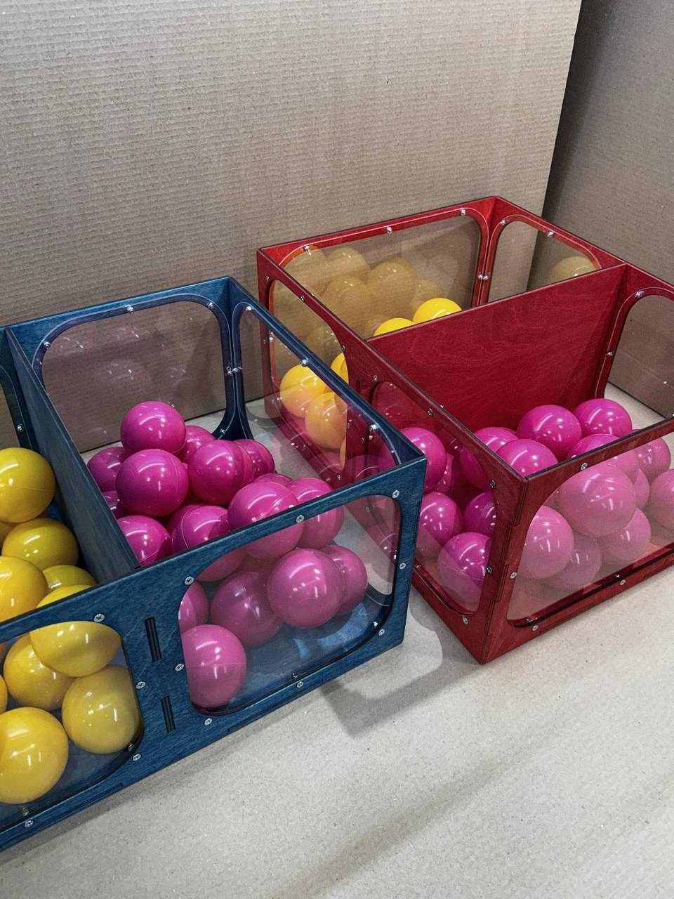 В одном отсеке лежат только желтые шарики, в другом - только розовые.